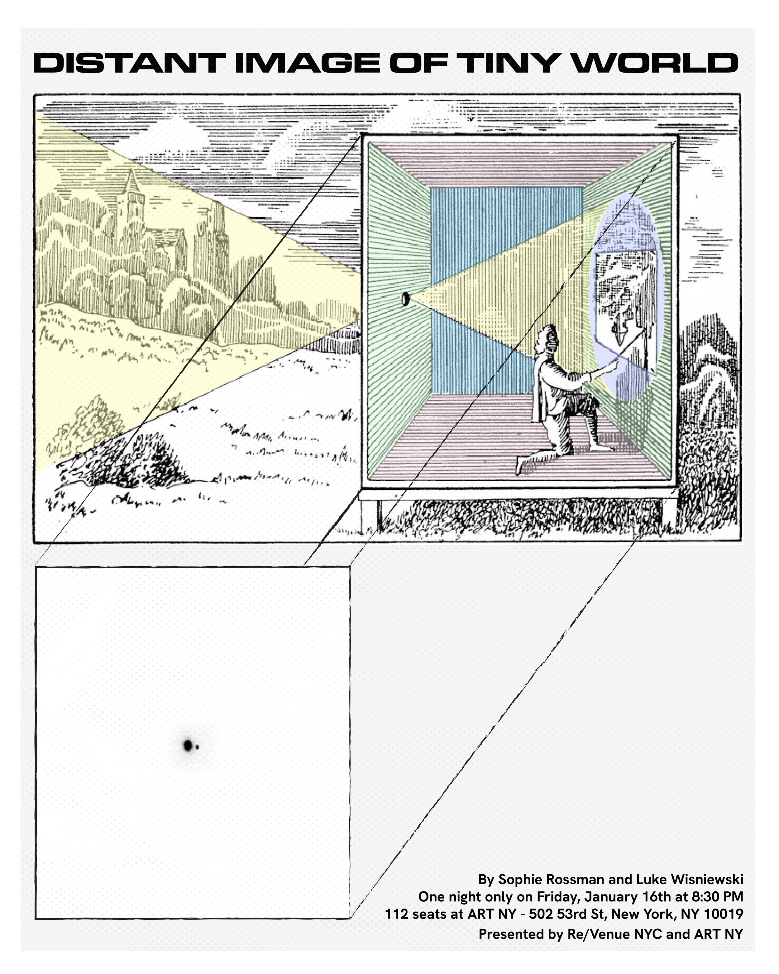 DISTANT IMAGE OF TINY WORLD is a kaleidoscopic, archival theater piece comprising an interstellar message to be sent into the future. Drawing inspiration from NASA’s Golden Record, Sophie Rossman and Luke Wisniewski lead us through a fragmented portrait of life on Earth and ask how today might be remembered tomorrow.